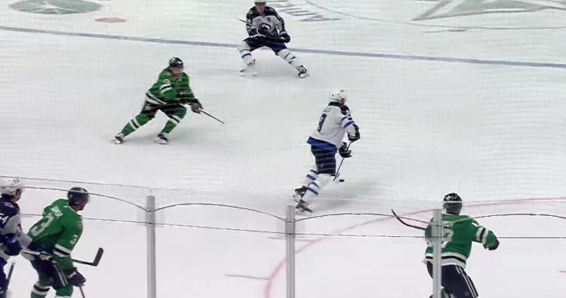 The Johnston line generated some further extended zone time for Dallas, including a couple of dangerous chances on a bouncing puck with bodies in front. It was, overall, an encouraging opening period through 17 minutes, with Dallas getting through the neutral zone with some speeded, and grabbing some Winnipeg entries and turning them the other way for useful counterattacks.