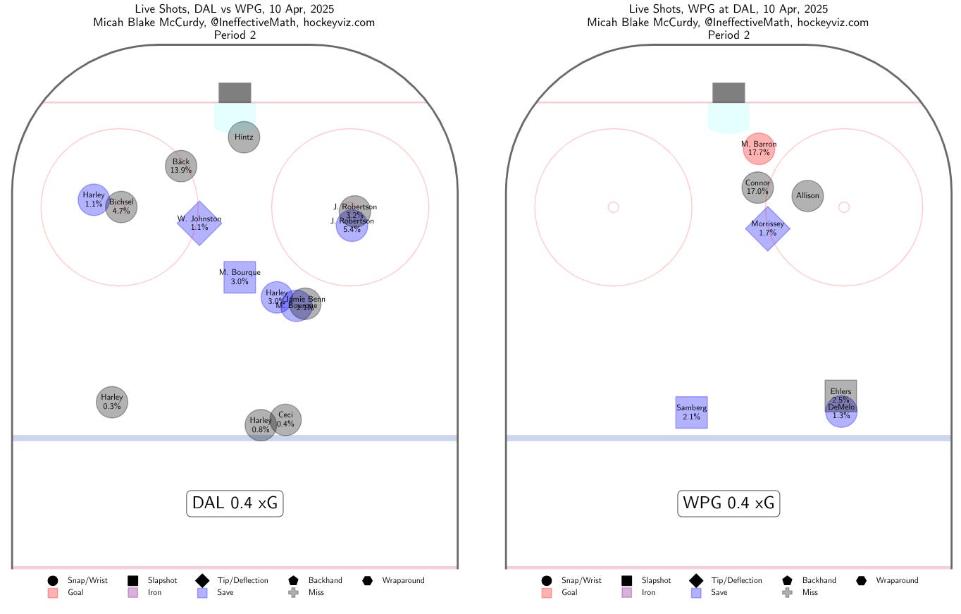 Shots were even, for once, though you’d be forgiven if you looked at the hits total and did a spit-take when you saw 36-16 for Winnipeg. But the Stars really did have the bulk of the possession as the period went on, as you can see reflected by the shots in the period.