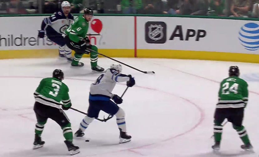 A small mistake would kill Dallas shortly afterward, when the Stars gave the Jets’ leading scorer a breakaway after an unfortunate bounce off a turnover. Bäck led a rush into the zone with Dumba joining, and Bäck sent a pass into the middle of the ice that was easily picked off.