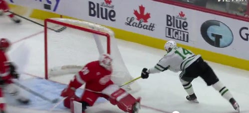 Cam Talbot started in goal for Detroit. Here is my obligatory “remember when the Stars declined to trade Julius Honka to New York in like 2014 for Cam Talbot” statement. Here endeth the statement.
