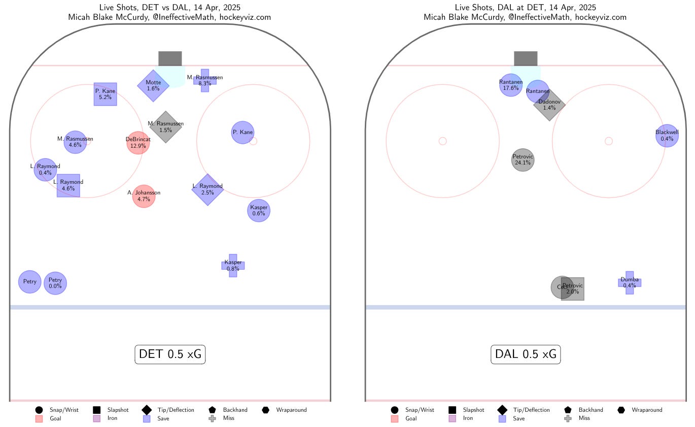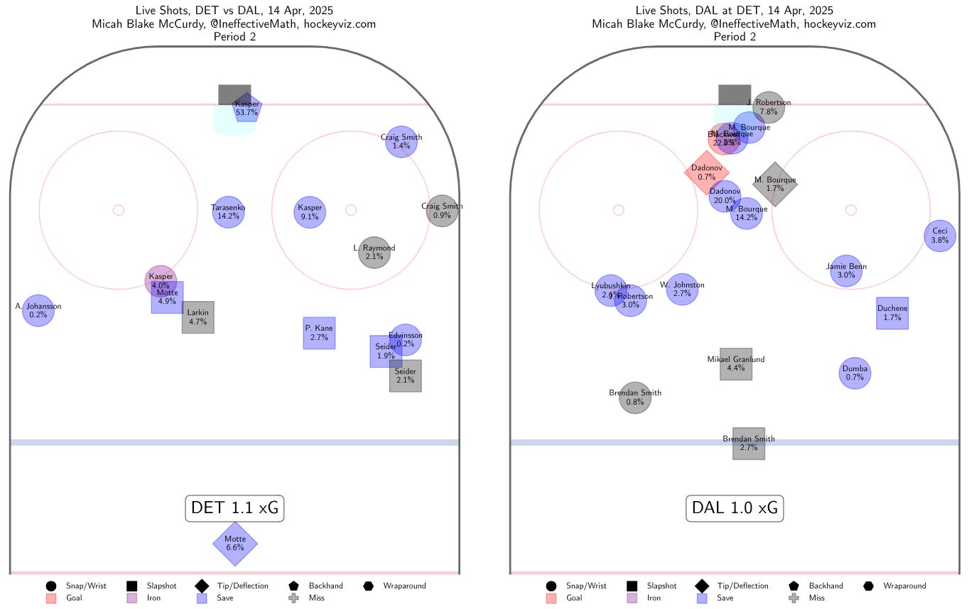 Scoring chances were not hard to come by for either team as the period wound down, and shots on goal ended up 16-7 for, and I am not making this up, the opponent of the Dallas Stars. Though as so often happens, many of the shots for Detroit came from low-percentage areas.