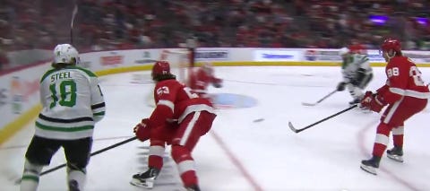 After a strong second period by Dallas defensively, they started reverting to their old (more recently) ways in the third, with Detroit pouring on the pressure early and Dallas, sans its top three defensemen, starting to bend to a breaking point.