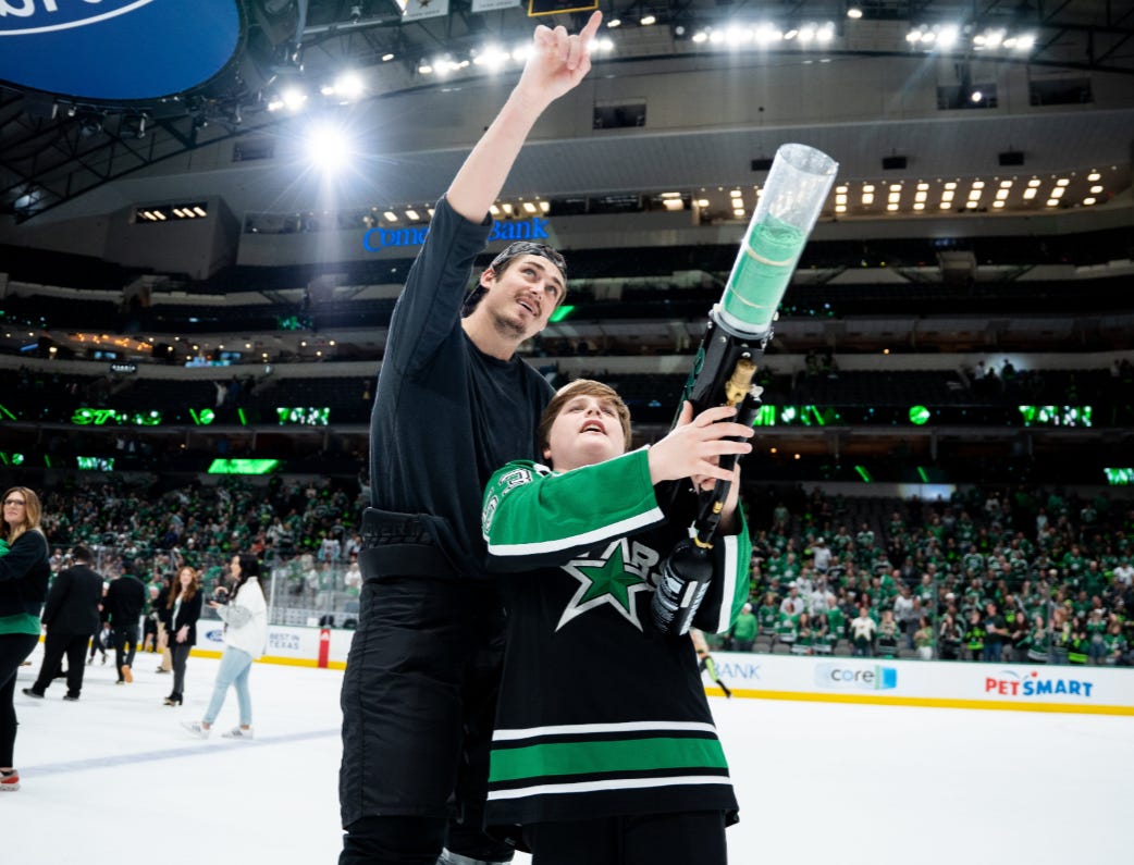This year, those t-shirts included a design by the winner of the Stars’ aforementioned contest: Kelsie Patterson. The Stars sent Kelsie and her family some of the shirts featuring her design ahead of the game, during which she not only got to be recognized for her design, but she also got to see current players launching more such shirts into the crowd.