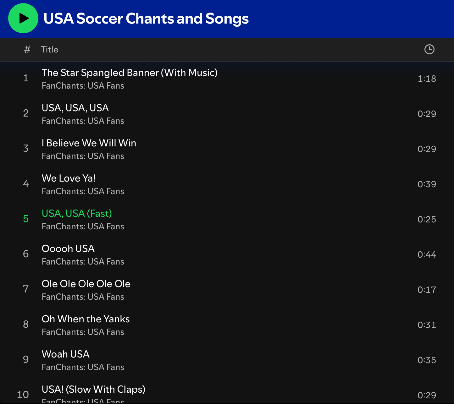 As an aside: USA and Canada just can’t compare to the energy and atmosphere that fans from other countries bring. This is also true in the soccer world, where even beyond the loathsome “USA! USA” chant, you have tired old anthems like “I believe that we will win!” that I have heard so many times more than I ever wanted to. And if you don’t think it’s quite as bad as all that, here is a screenshot of the top Spotify playlist for USA soccer songs and chants from ten years ago: