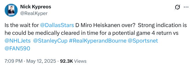 That’s a lot to read into a pretty standard press conference, but Petrovic sounded confident that Heiskanen would be back, not that he might be back. You could read that as simple alignment with DeBoer’s similar confidence in Heiskanen’s imminent return.
