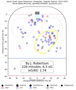 Robertson shoots when there is good reason to, and his best seasons (thus far) in goal-scoring have featured a lot of tallies that look just like this one, where he’s able to cut into the ice between the circles and rip a shot past a goaltender high: