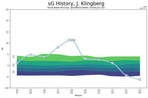 This is all predicated on the assumption that Klingberg will look like his old self rather than his recent self, of course. Take the HockeyViz metric of sG, for instance (Synthetic Goals), which reflects Klingberg’s career arc pretty accurately thus far. Can you guess where his hip started bothering him again? Go on, guess.
