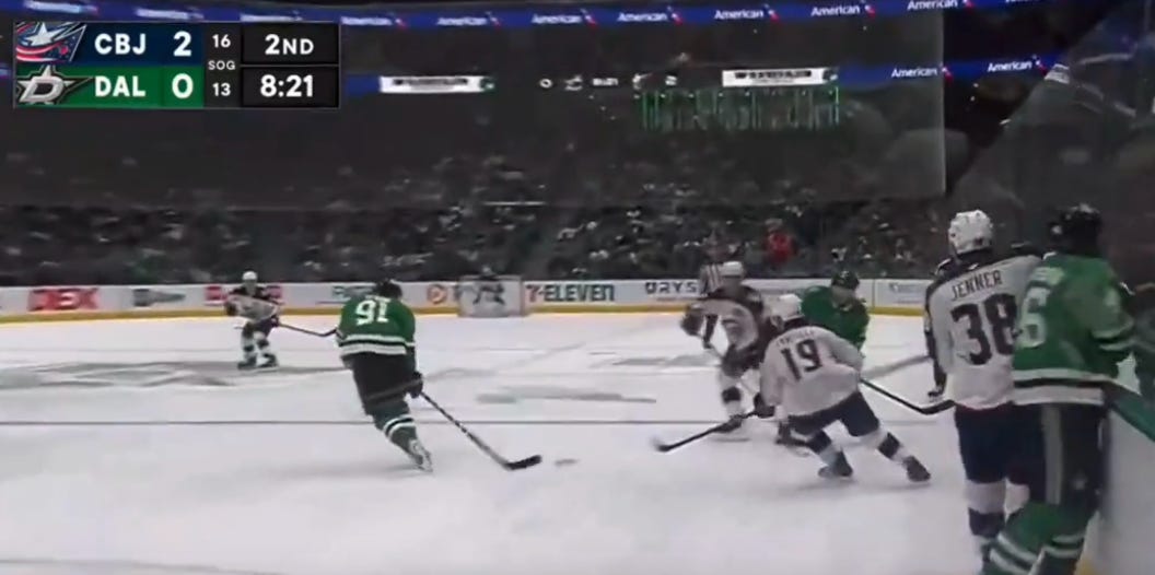 It’s a great little play against the heavy, three-man forecheck Columbus had going. You’ve probably noticed similarly heavy forechecks causing issues for the Stars in prior games, but here, the Stars managed to escape it with a pretty simple play. One of the two Columbus defenseman is forced to step up and cover Erne at the blue line, leaving just one player back in the neutral zone to face Seguin and Blackwell after the slick pass (and gathering of said pass by Seguin) got the Stars on their way.