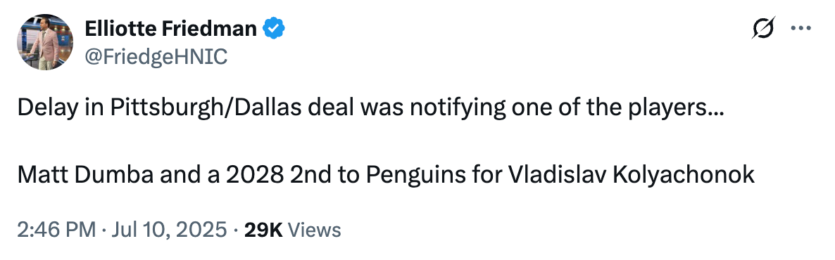 The Stars finally made the move that seemed like a foregone conclusion months ago, as they traded Matt Dumba to the Pittsburgh Penguins in exchange for 24-year-old defenseman Vladislav Kolyachonok on Thursday. Dallas also sent Pittsburgh a 2028 second-round draft pick to complete the deal.