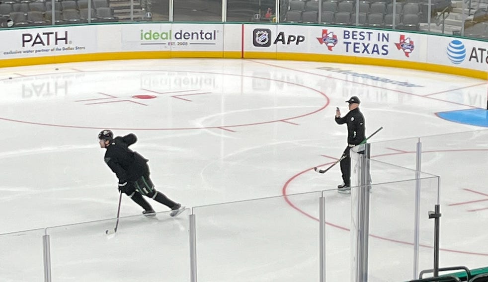 Glen Gulutzan says Lian Bichsel is still “to be determined” regarding whether he will return for the Stars’ final game of the Olympic Break or not. Bichsel worked out on the ice for a while with David Pelletier before the rest of the team arrived, and the focus was clearly on Bichsel’s testing out his healing foot, with him alternately trying different skating exercises on one leg at a time. As Gulutzan has said, it’s all about ensuring Bichsel is pain-free before he returns.