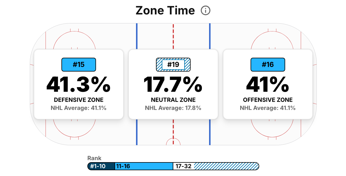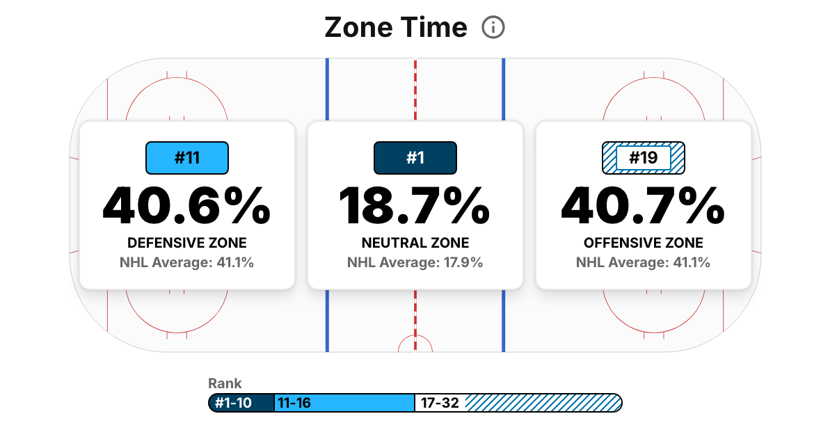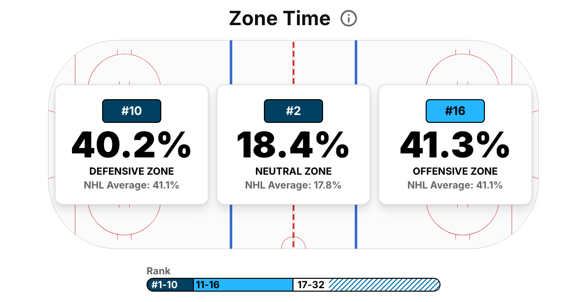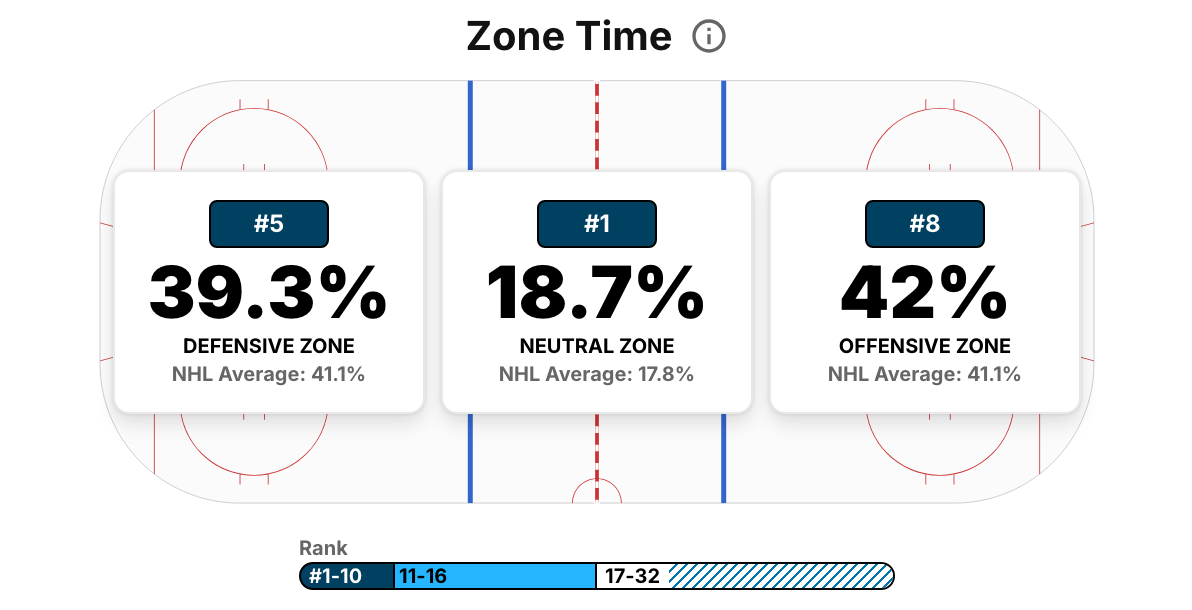 This is where it’s important to understand the limitations of a single chart. The time spent in either end might seem to balance out, but the way that time has been spent for either attacking team has been far from equal. NHL EDGE has the Stars as 6th-best in high-danger shots generated, while they give up far less quality in their own end. Defensive numbers aren’t as accessible as offensive ones through NHL EDGE data, but Natural Stat Trick has the Stars’ high-danger shot attempts allowed per game at the 6th-fewest in the league, which is likely a consequence of Gulutzan’s new defensive zone scheme.
