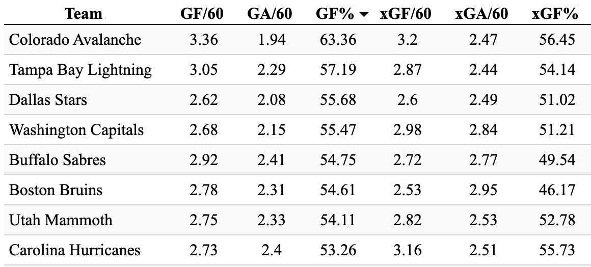 The big question here is not about the offense. Dallas’s actual 5v5 goals are right in line with their expected goals for. Rather, it’s fair to ask whether their defense can continue to allow markedly less than expected (2.08 actual to 2.49 expected) when the playoffs arrive. But if they can continue to win the battle for highest-danger chances from night to night, that will at the very least allow their special teams to be a very big factor in close games. And special teams have been a big strength for this club this year, as Wyatt Johnston knows better than anyone.