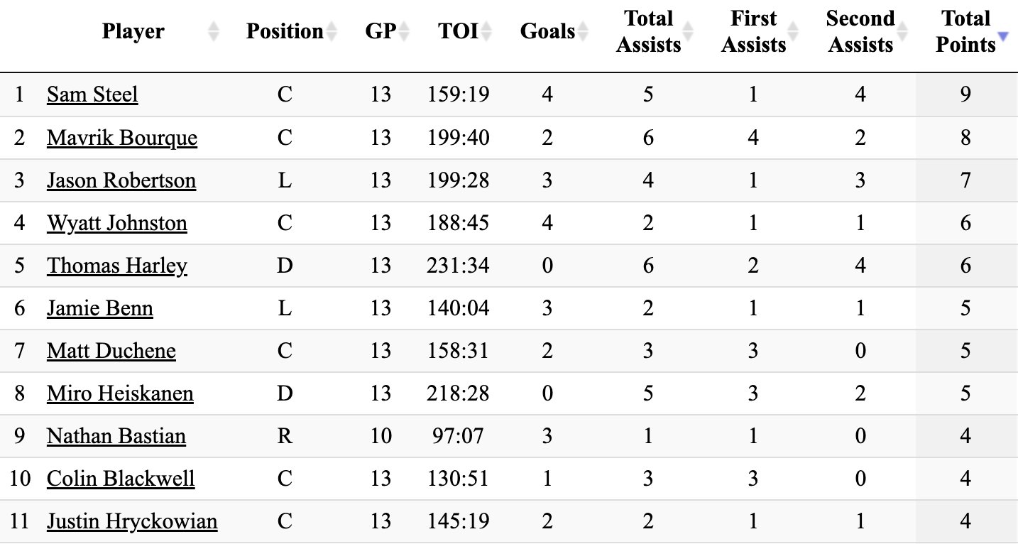 Oh, I’m sorry. That’s not correct. The name we were looking for—the Stars’ 5-on-5 scoring leader over the last 13 games? That would be one Sam Steel.
