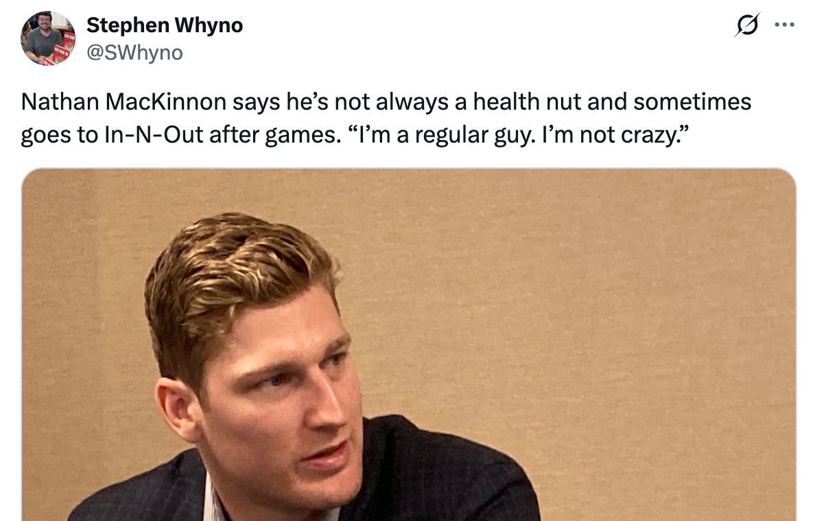By the way, three of Nathan MacKinnon’s goals are empty-net tallies, which means they are fake. Robertson hasn’t messed with such nonsense this year, so really, he’s only four behind the unconscious and Very Normal Nate MacKinnon. And how do I know MacKinnon is normal? Why, because he said so himself!
