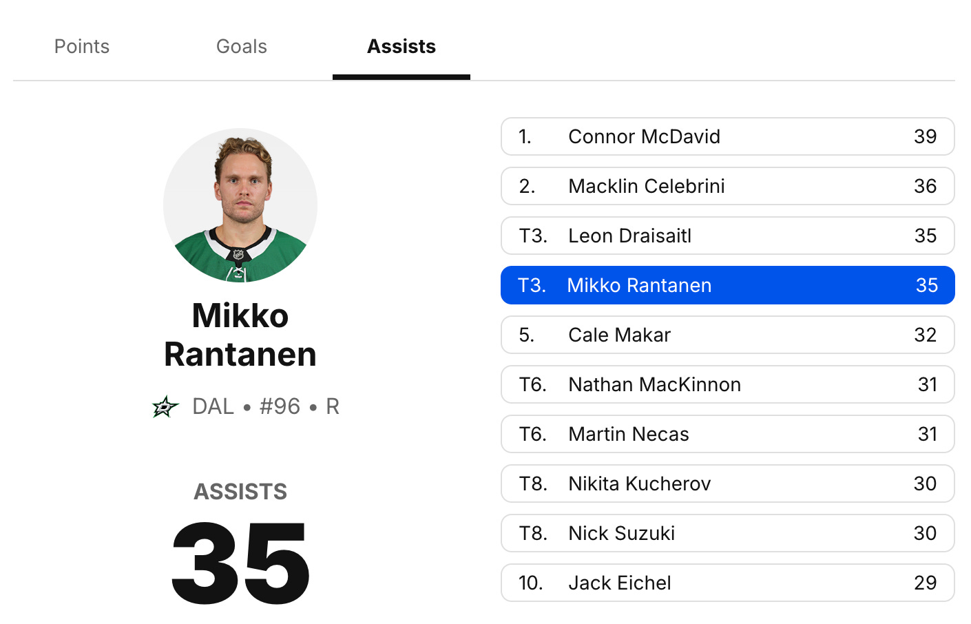 Mikko Rantanen is leading the Stars in assists. He’s also tied for 3rd in the league, this time with some guy named Leon Draisaitl.
