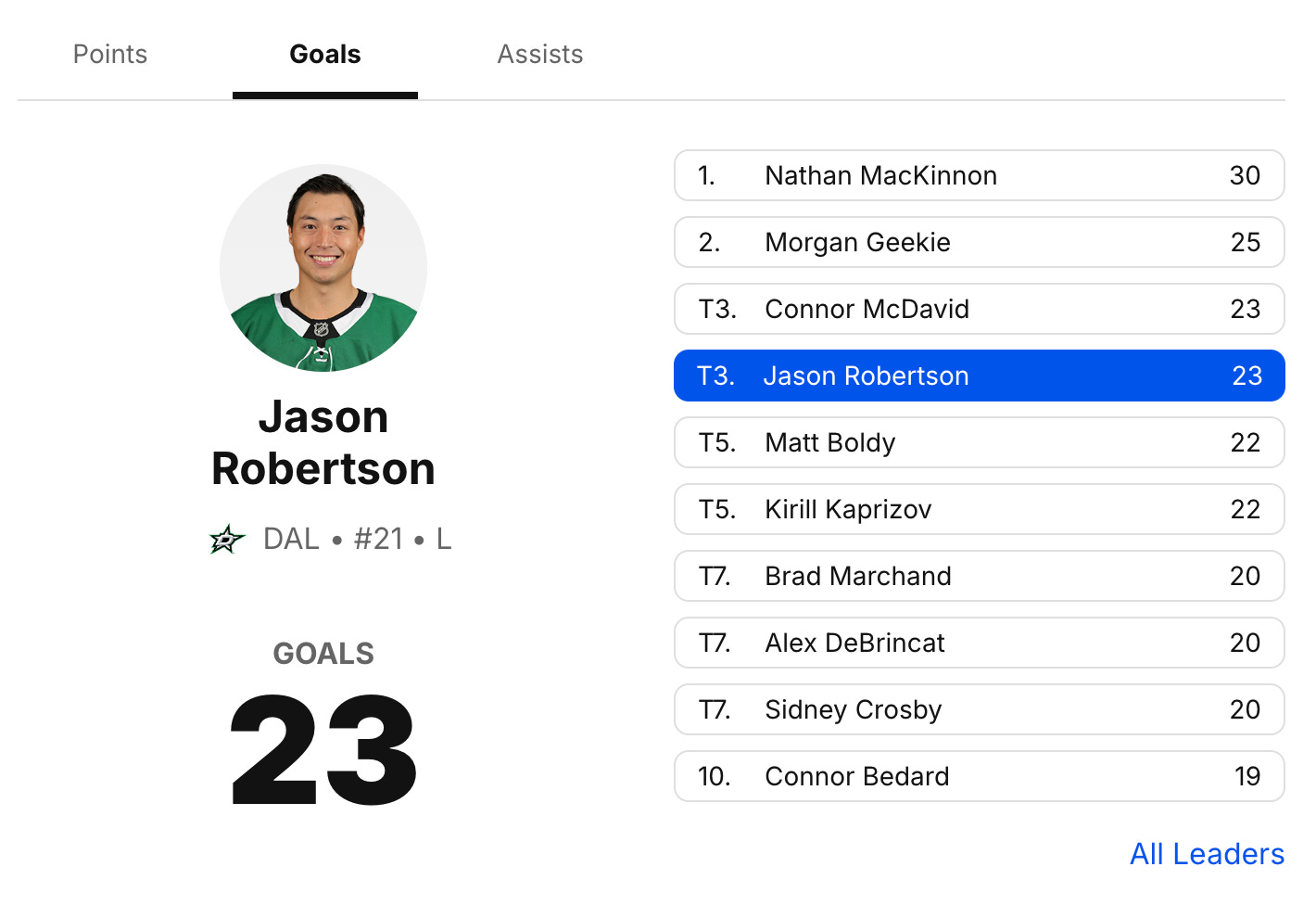 Jason Robertson leads the Stars with 23 goals. He is also tied for 3rd in the NHL alongside some guy named Connor McDavid.