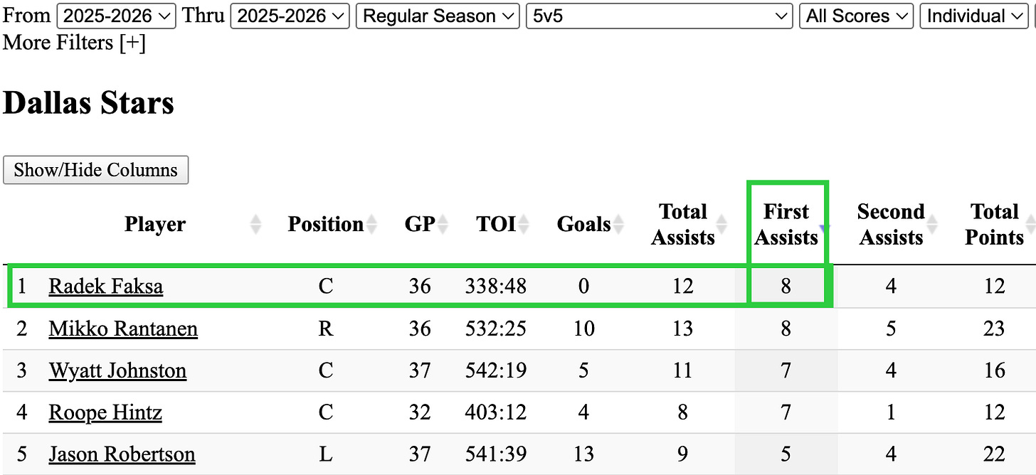 Also, Radek Faksa still leads the team in primary assists at 5-on-5. Well, co-leads with Rantanen, but given how absurd this is, I’m not going to qualify it.)