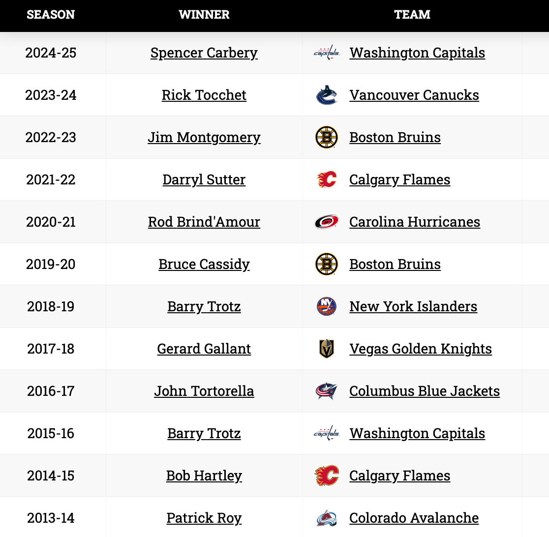 You may recall some amusement a year or two ago about the fact that all three finalists from 2023 were fired not long after being voted as such. And indeed, the same is true of (most) of the winners: they didn’t last long at all, with the exception of Rod Brind’Amour. The volatile nature of coaching in the NHL means that almost any hiccup (or even a Western Conference finals run…) can end with a coach losing his job.