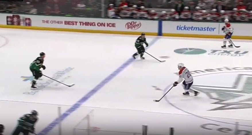 Yes, it’s during a line change by Montreal, but Heiskanen (#4 in black) is at the top of the three-man triangle here, and he’s able to combine with Rantanen to easily push the puck-carrier wide.