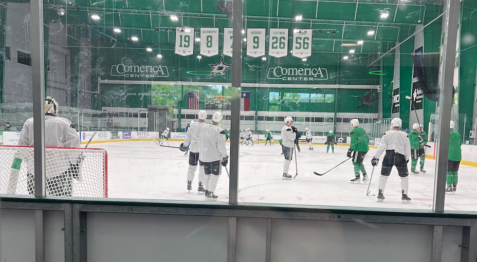 As far as the power play personnel this morning, Glen Gulutzan and Neil Graham are sticking to their aforementioned plan to use both of their top defenseman on the top power play. Miro Heiskanen was running the top power play with Rantanen, Robertson, Hintz, and Johnston, while Harley was back running the second unit—a group that saw Sam Steel drawing in for the injured Jamie Benn, along with Seguin, Duchene and Bourque.