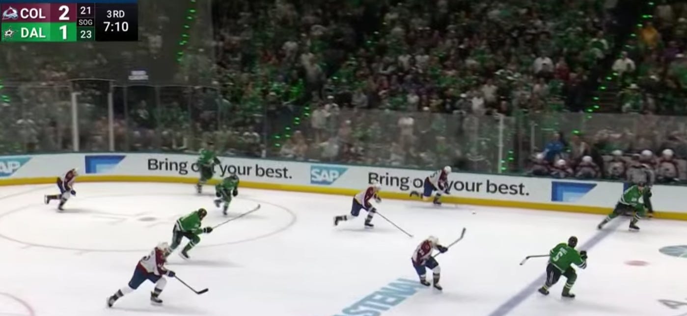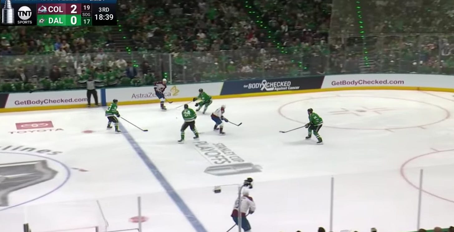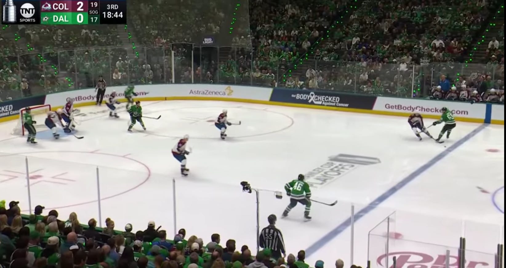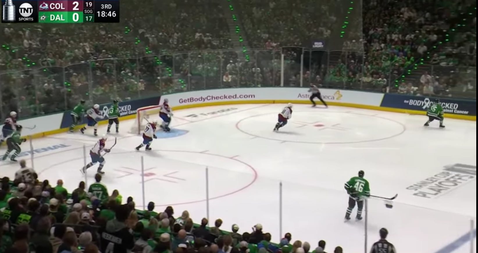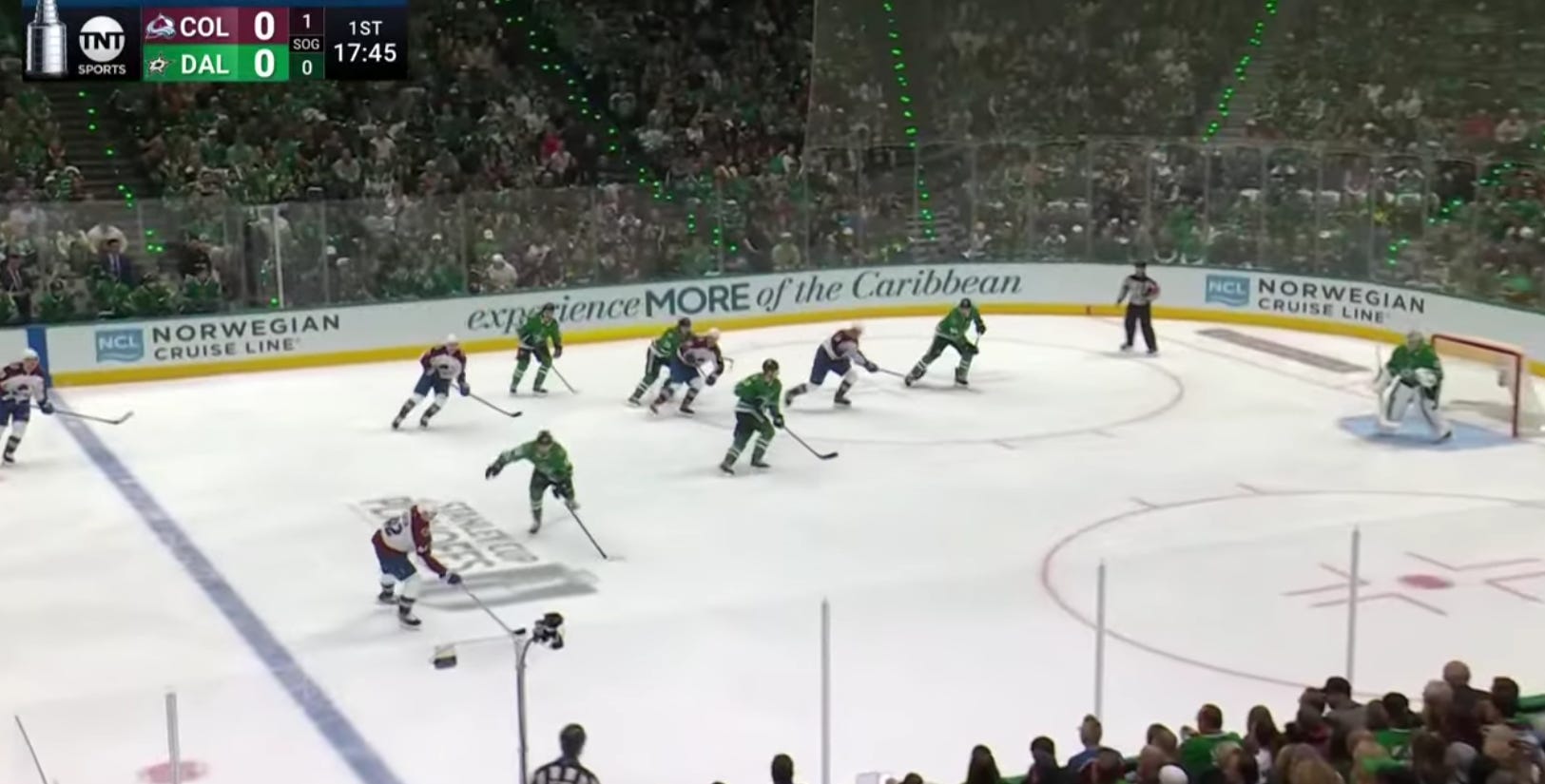 The point here is that the Avs were allowed to come back down and gain the blue line for free after the Stars overpursued down low in the offensive zone and got beat cleanly, and it all ended in an easy zone entry and, eventually, a prime scoring chance for Colorado.