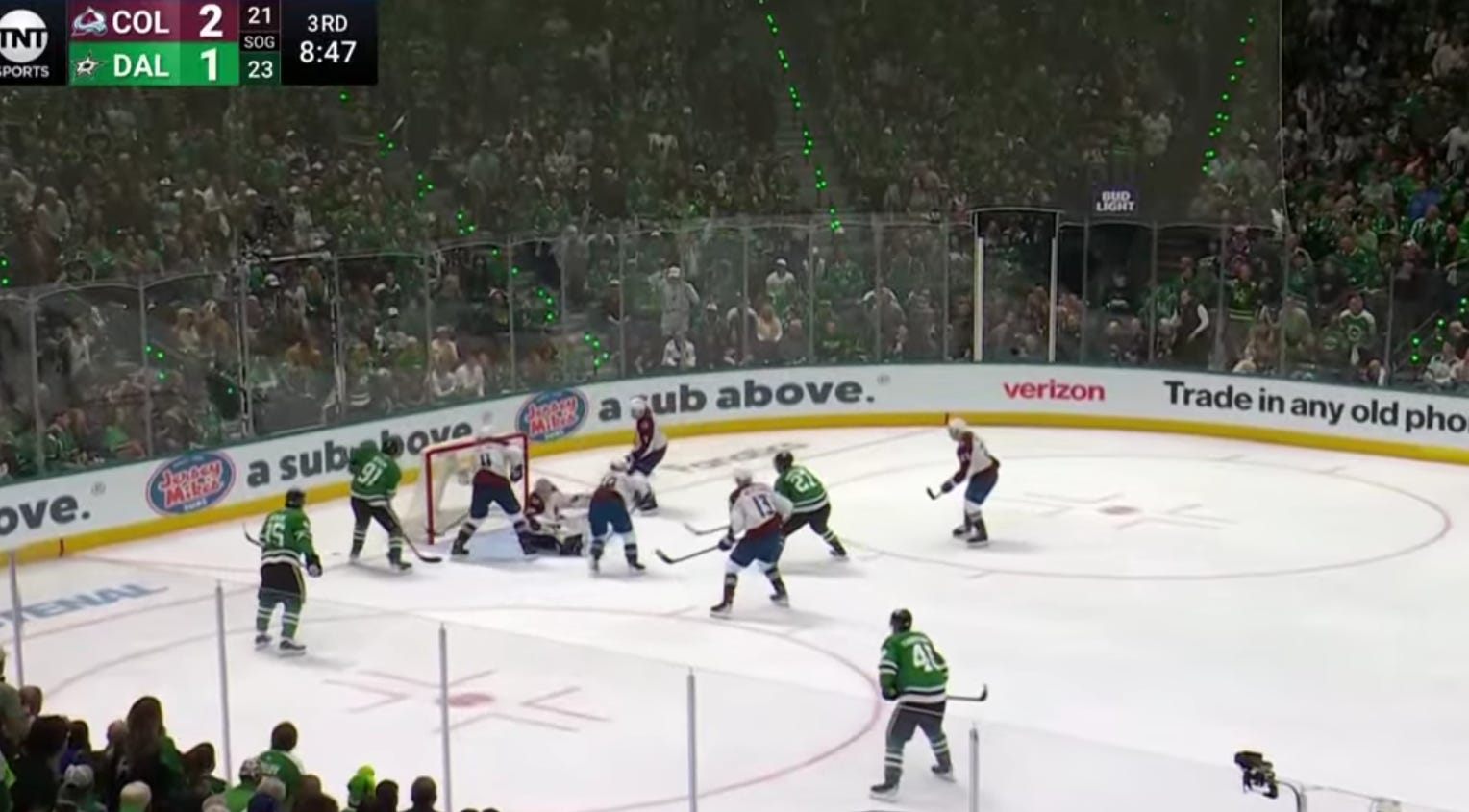 And the Stars can’t clear the zone as a result. The Avalanche end up winning the puck back and cycling it around for an open shot from Josh Manson, with bodies going to the net: