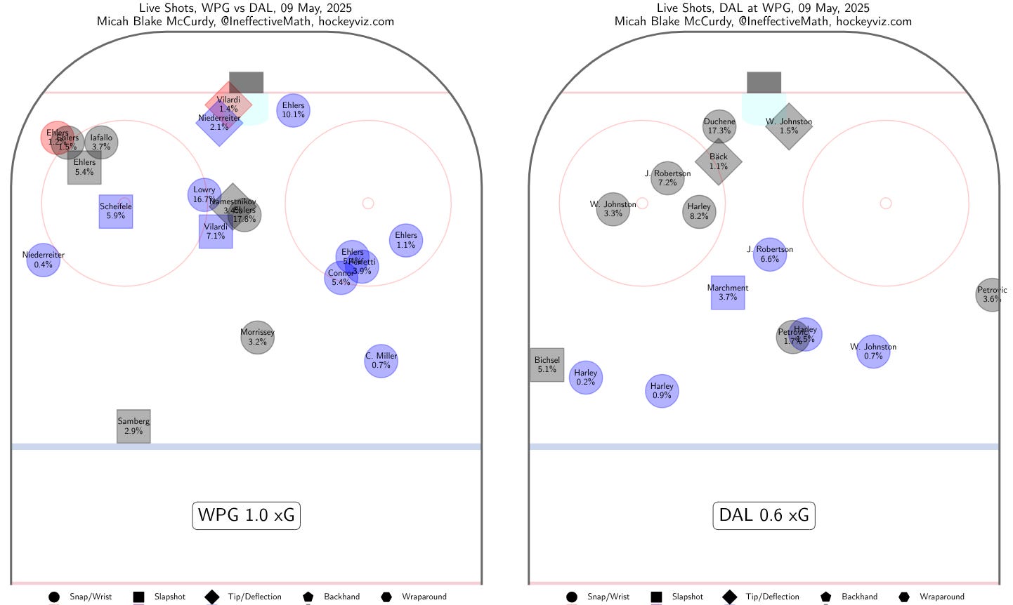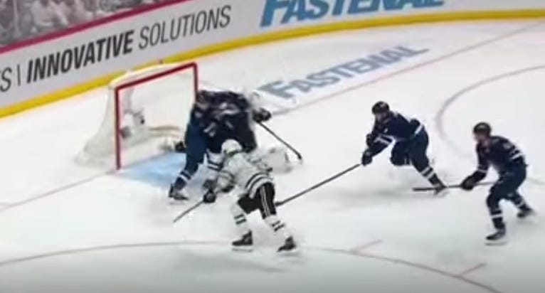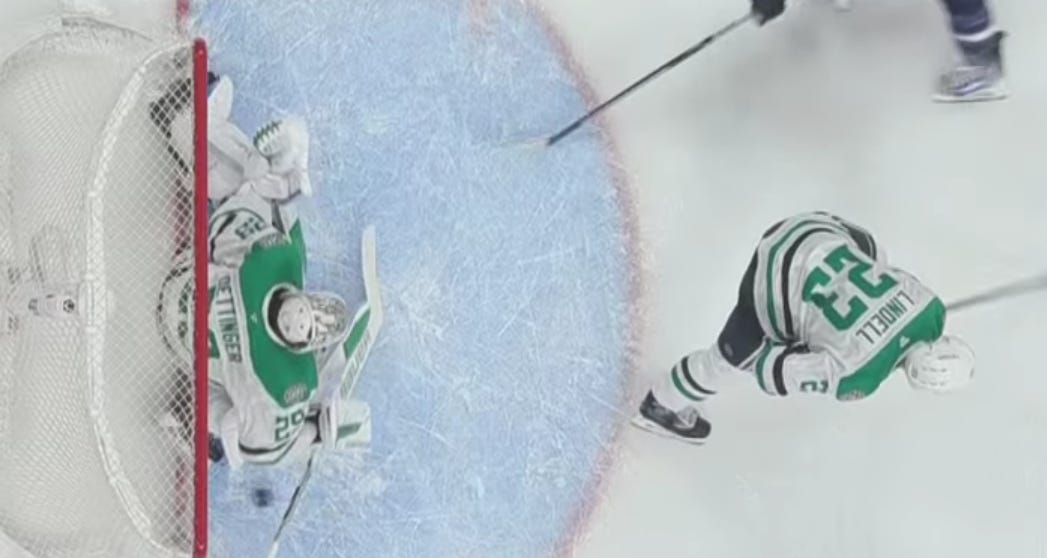 Dallas killed the first two minutes efficiently, though Kyle Connor did what Dallas saw them doing in Game 1, in taking the space Dallas’s PK gives down low and trying to curl in front and rip a puck over Oetting’er shoulder at the near post.