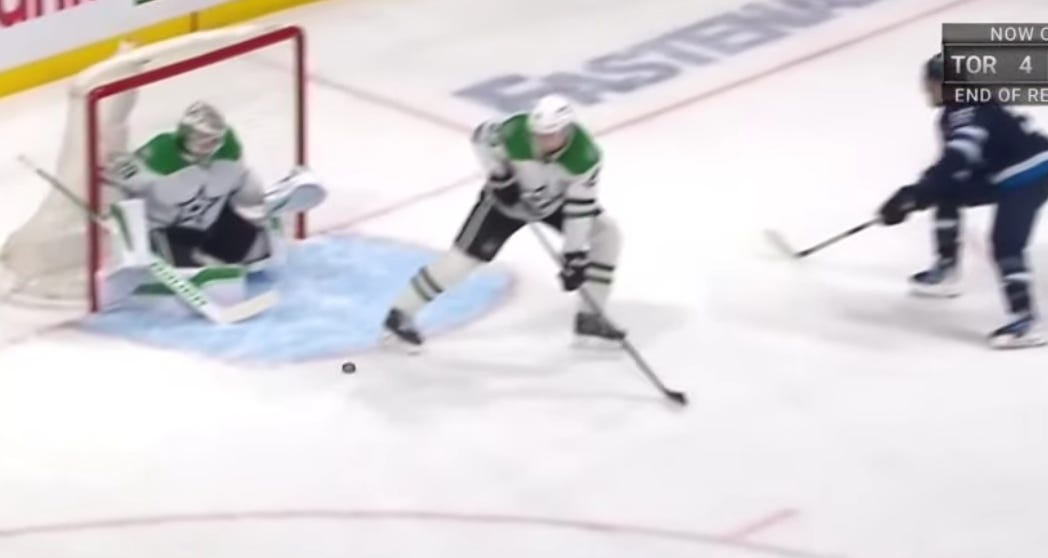 It nearly worked out for Dallas, however, as Sam Steel got a half-breakaway, but his attempt to pull up and do what Robertson did (plus a goal) didn’t come off, and Steel never got a shot off.