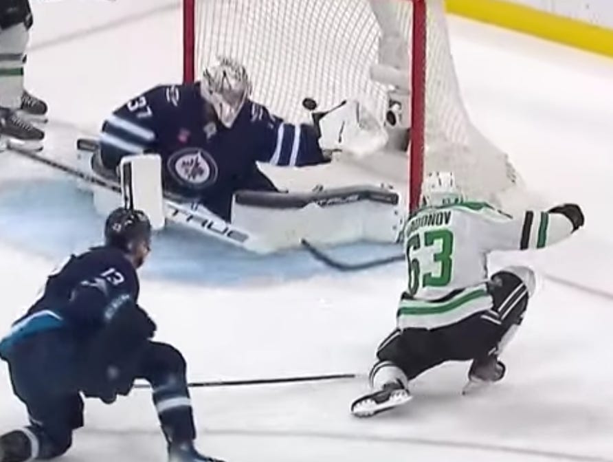 The ensuing play would see Dallas with another chance to climb back into the game when a rebound slid beautifully for Evgenii Dadonov to pound home, only for Hellebuyck to reach out desperately and put his glove hand in what turned out to be the right spot, robbing Dadonov.