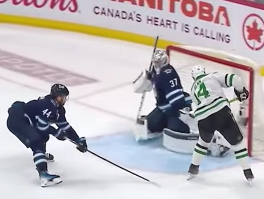 Dallas weathered the worst of the Winnipeg power play early, though given the score, Winnipeg’s hearts probably weren’t entirely in the fight. Still, it meant Dallas had a glimpse, and a great Harley keep after the penalty expired led to a Rantanen look that Pionk poked off his stick just before he executed a move in the low slot.