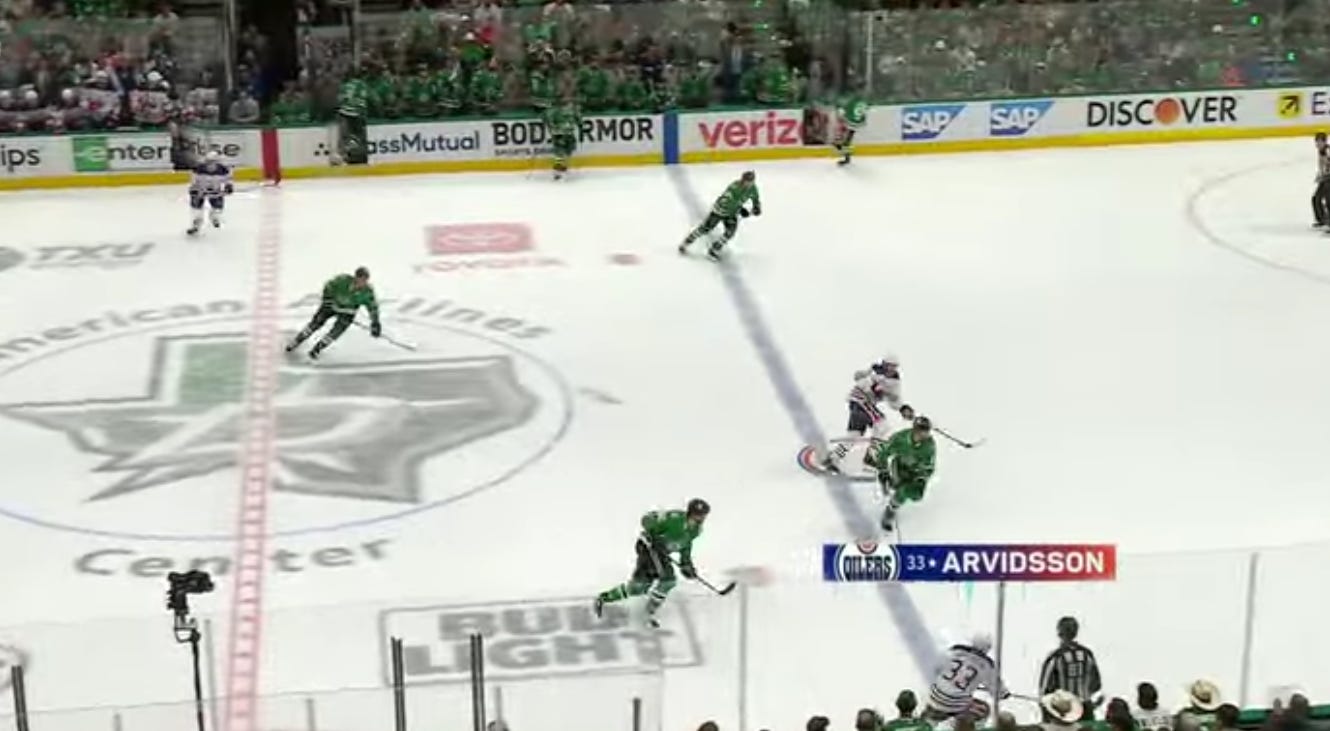 But the Johnston line came on and continued the pressure, hemming Edmonton in their zone as Mavrik Bourque got multiple looks at the net front, and Mattias Ekholm finally decided enough was enough, and he hauled down Bourque well ahead of another pass to the crease, putting Dallas on the power play.