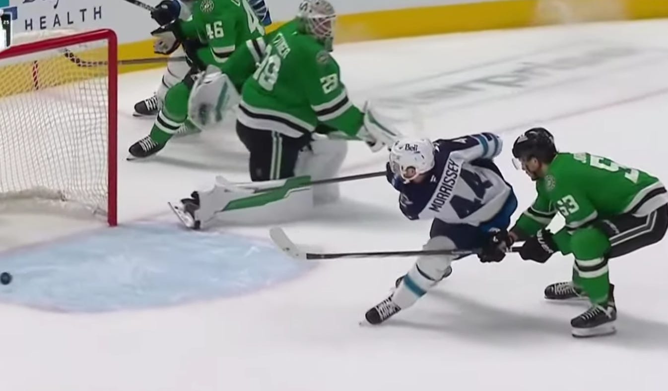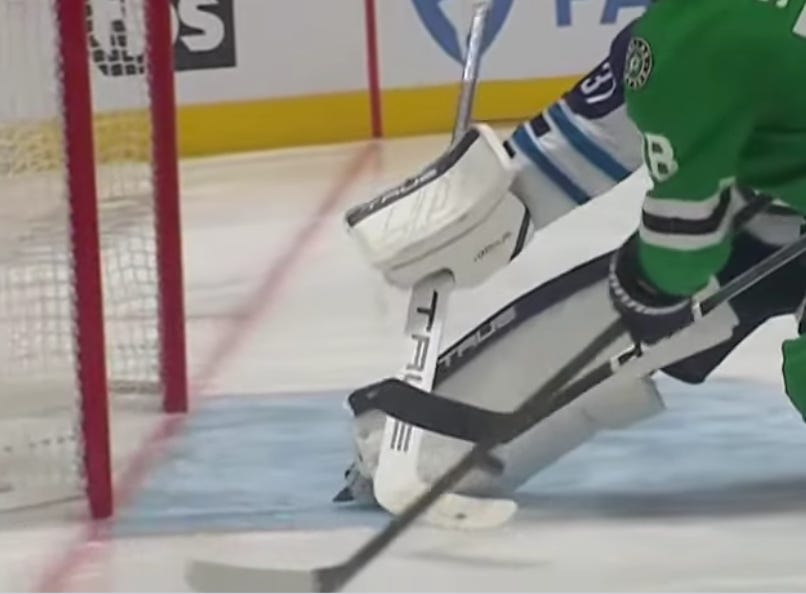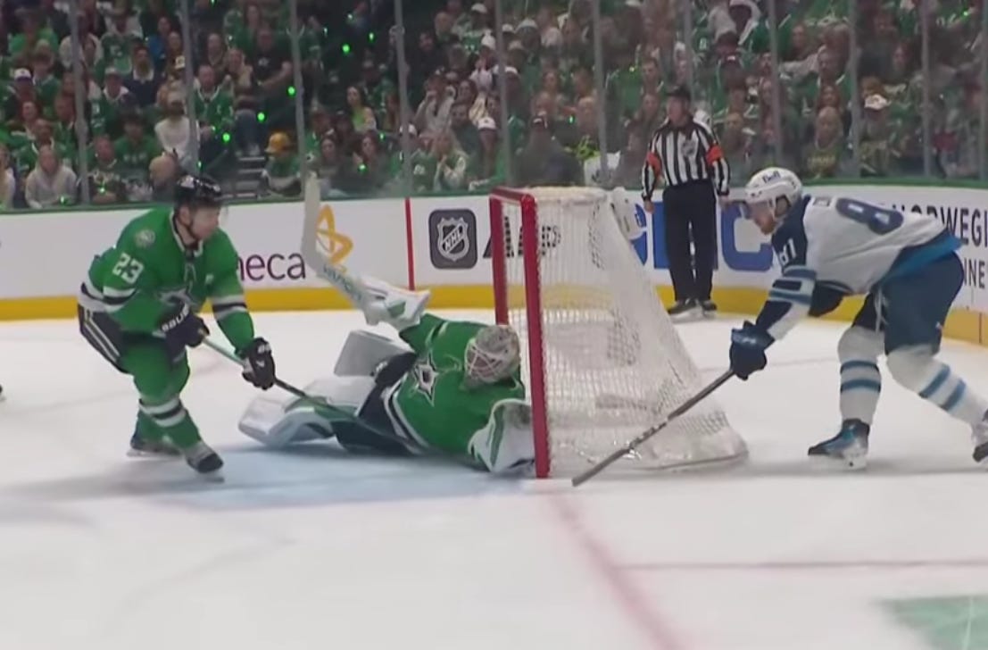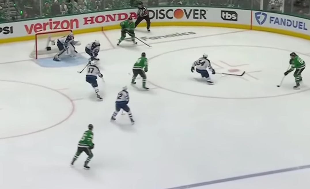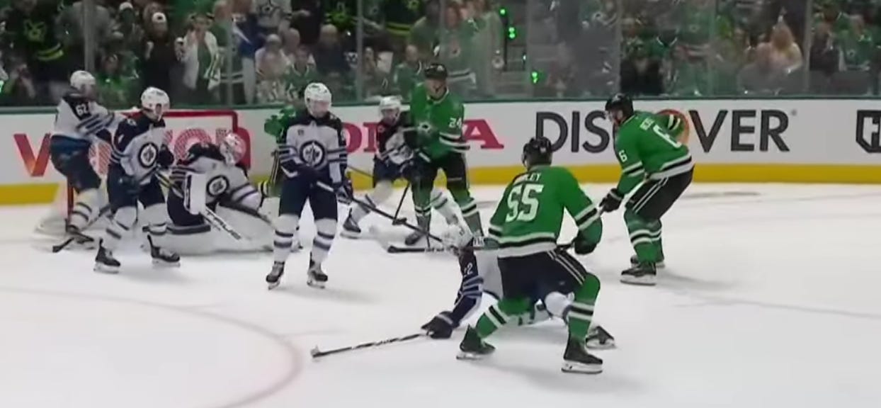 Johnston’s first shot actually went off (I think) Morgan Barron and Hellebuyck, and he had to shoot the puck once more to actually put it in. But rebounds are allowed in this league, and that is probably a good example of the type of goals Dallas has talked about scoring on Hellebuyck for much of the season, let alone the series.
