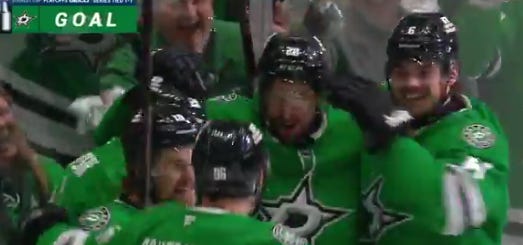 In any case, Hellebuyck lay in the crease on his back with pure despondency after the goal—I think he knew how it was going to end, given how these playoffs have gone for him—and the Stars kept the pedal down right afterward, with Johnston narrowly missing a back-post tap-in off the rush.