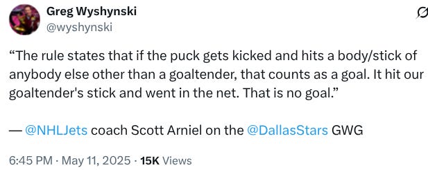 Hellebuyck is mortal in road games. That’s the truth of the matter, whether it’s a cosmic accident or something in Hellebuyck’s head or whatever. So if the Stars can capitalize on that twice in the next three games, they won’t have to worry about the fact that Game 7 is in Winnipeg. Because they won’t ever have to play in it.
