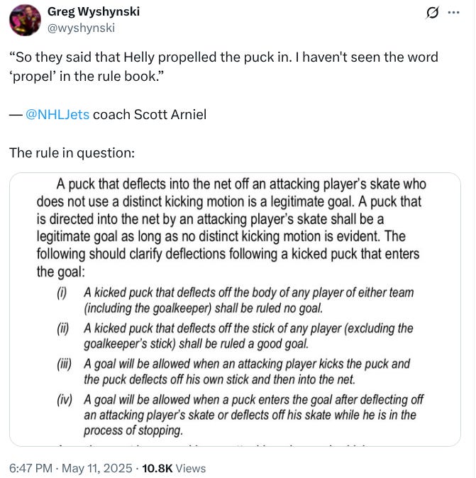 As for Pete DeBoer, he simply said that the officials had explained that Hellebuyck “propelled” the puck into the net, which I took to mean the officials interpreted Hellebuyck’s actions as not a save attempt (which would still mean the puck was being kicked in), but rather a separate action altogether.
