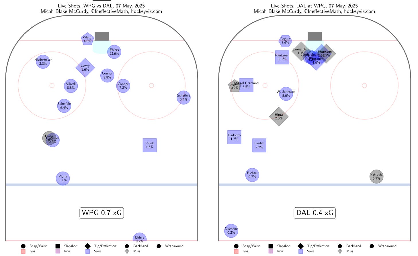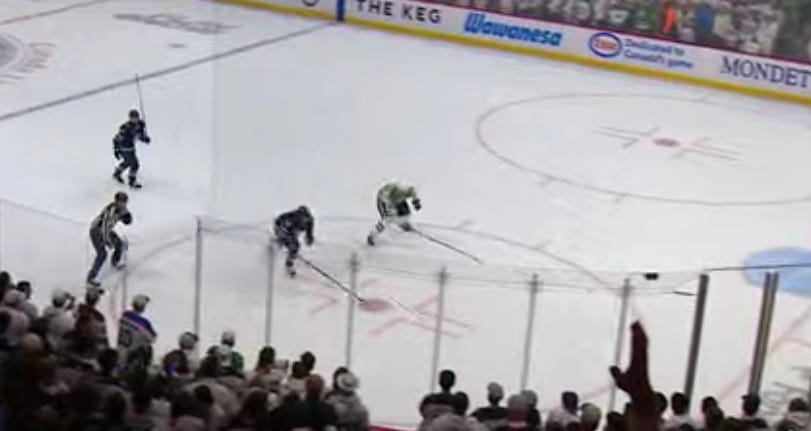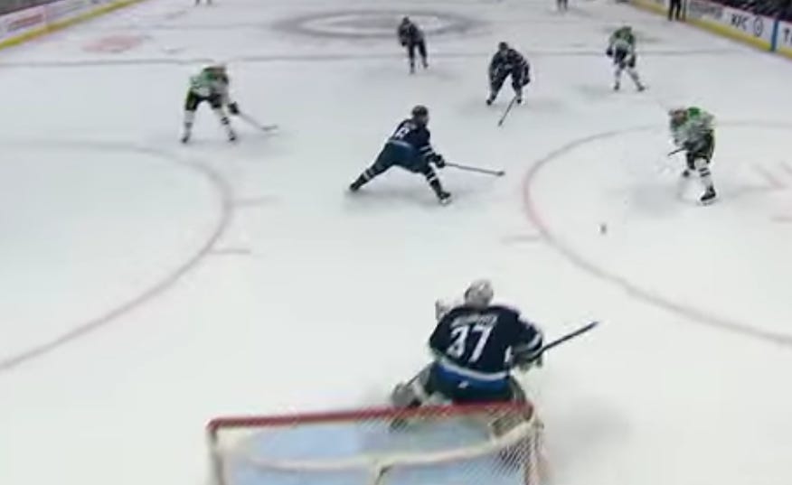 The final ten minutes of regulation came, and you could see Dallas’s plan: defend the blue line aggressively, but look primarily for counterattack chances. Hintz, for example, got just such a chance when the Jets lost track of a puck in the neutral zone, and Hintz sped in and ripped a puck on Hellebuyck that bounced off for one of many rebounds of a far better quality than a goalie like Hellebuyck is supposed to allow, though it wasn’t collected by Dallas for anything further.
