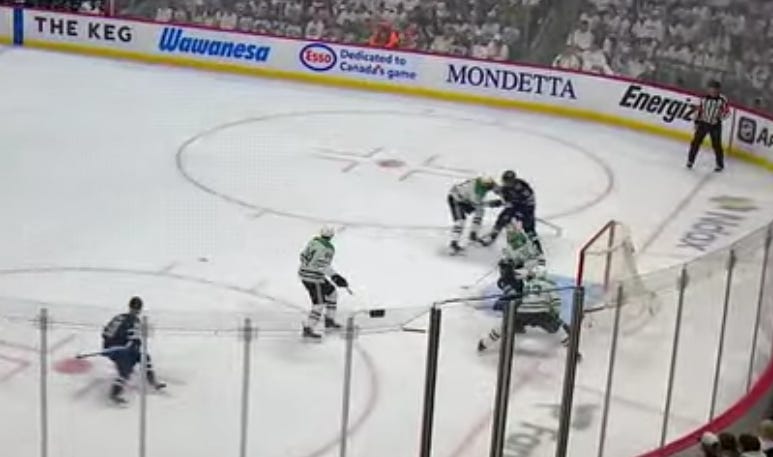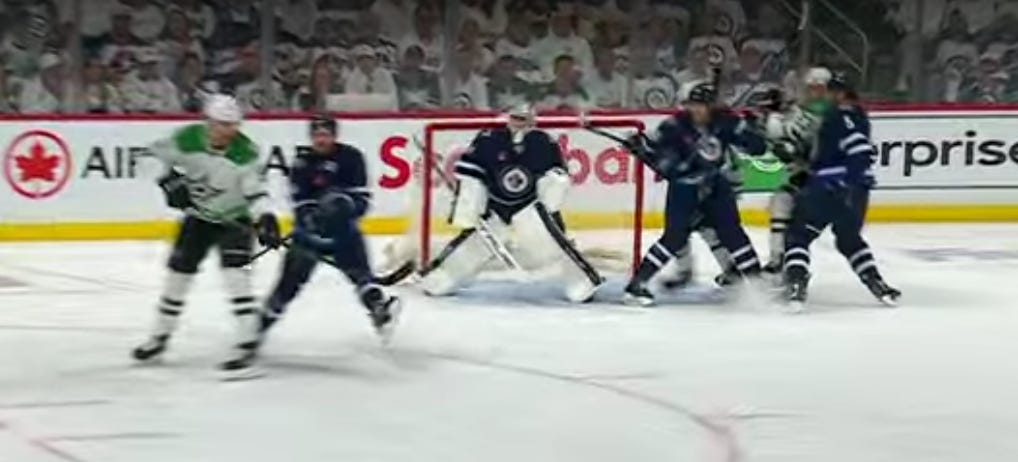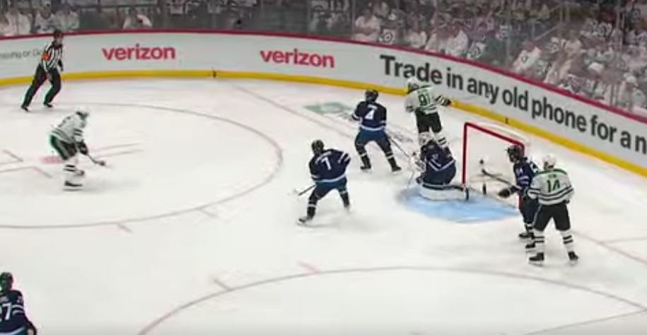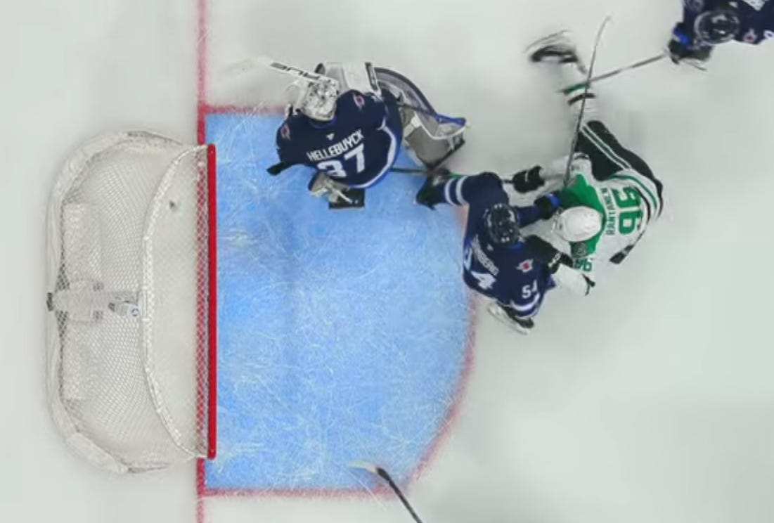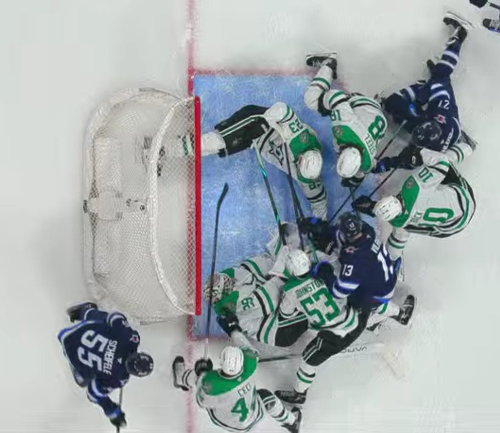 After the Jets pulled Hellebuyck, the Stars had a mad scramble at the net front after a couple of Oettinger saves, but his teammates arrived to help him out, as you can see here, after Esa Lindell kicked a puck out with his skates and fell to the ice to become a goaltender for any subsequent chances.