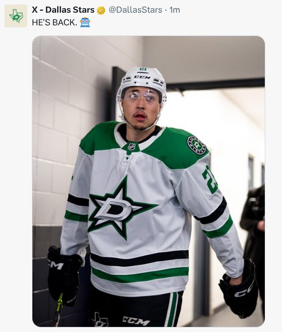 The Stars began the game with this lineup, which included the return of Jason Robertson, as we kind of thought it might even before practice yesterday: