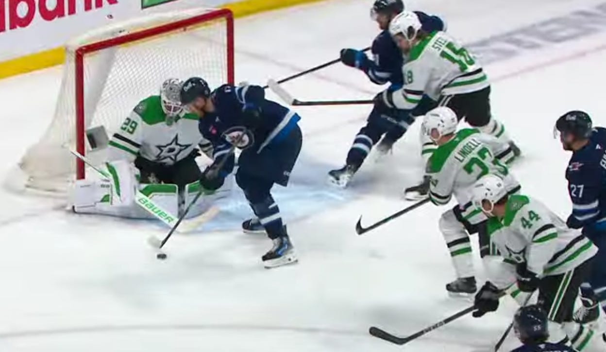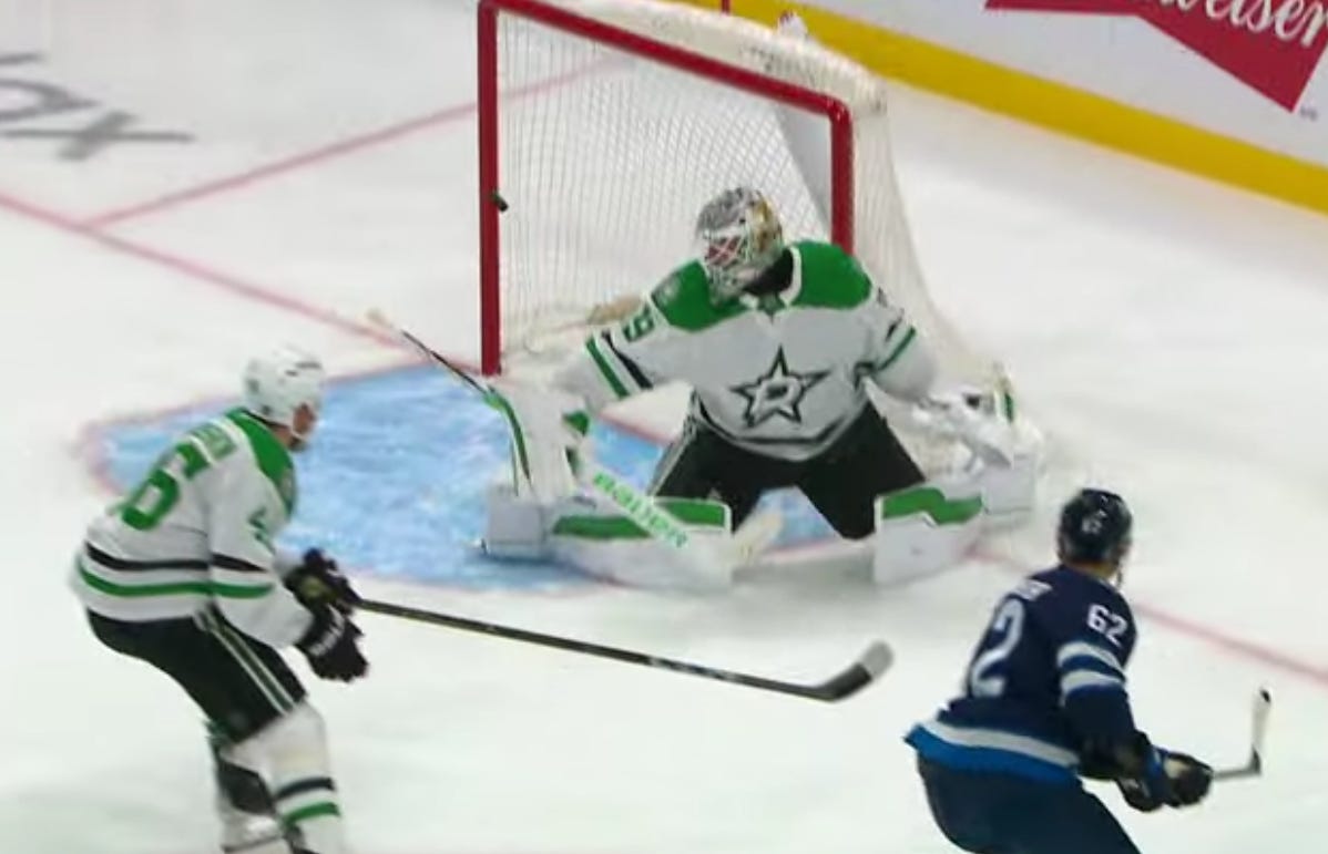 The Jets would finally establish some offensive-zone possession after that, and Oettinger had to come up huge on a Kyle Connor one-timer that ricocheted up off Lyubushkin’s skate and into his armpit. But the Stars goalie nevertheless found and held the puck.