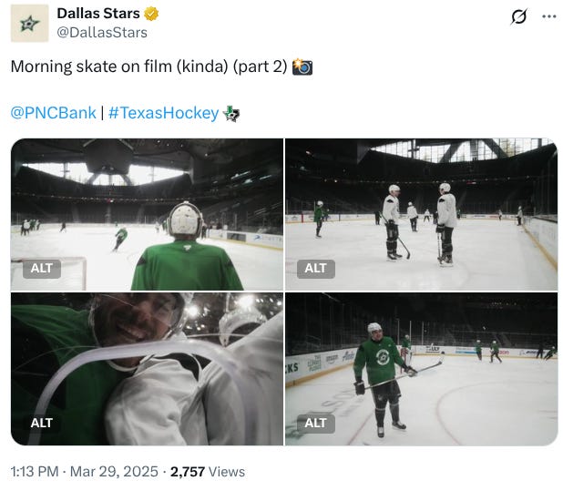 Tyler Seguin joined the rest of the team for another morning skate, which has become more common in the last ten days or so. Seguin looks very quick on the ice, and while DeBoer was clear last week that Seguin needs to build up by stringing together four or five days’ worth of serious work on the ice, seeing him participate in hockey activities without any obvious limitations is a welcome sight.