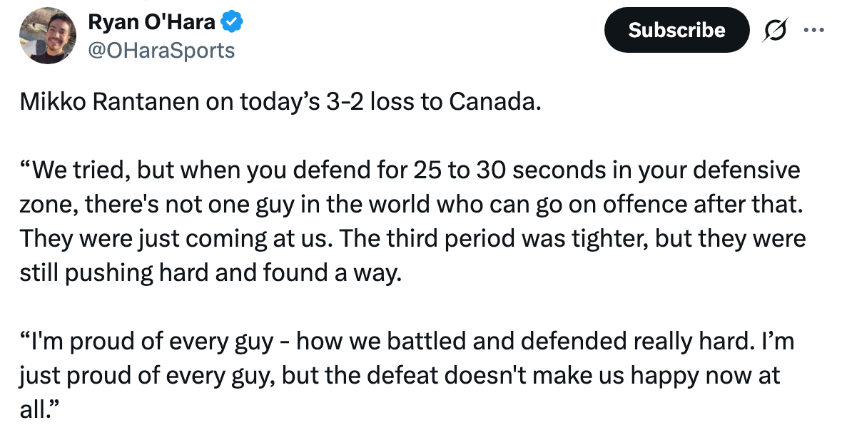 Speaking of the bronze medal game, that one might mean a tad more to Miro Heiskanen than to those of his teammates who already won gold at Four Nations (though we aren’t mind-readers here), but the Stars organization is probably hoping he doesn’t play another 27+ minutes.