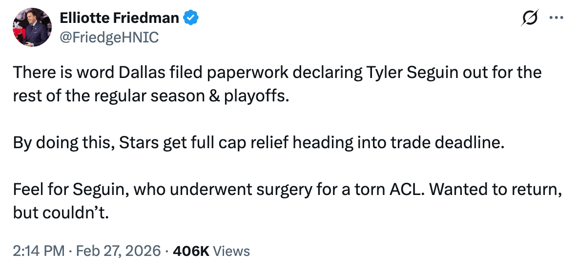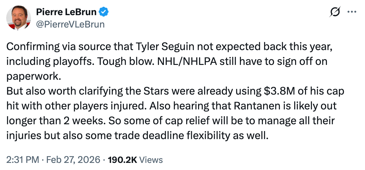 We already discussed the salary cap implications of this decision, but in brief: The Stars’ putting Seguin on Season-Ending LTIR will give them another $6 million or so to use over the next week on top of the space they already have. And when you survey the market, one thing becomes readily apparent: The sort of player the Stars could really use right now is, well, Tyler Seguin: a forward whose skill and hockey IQ complement any of the Stars’ top three centers. But alas, it sounds that specific player is done for the year, officially. (Or at least, reportedly.)