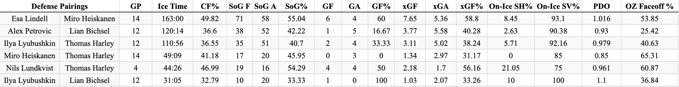 Lindell-Heiskanen is the mover and shaker of the Stars’ defense corps at 5v5. The Stars have scored 6 goals and allowed 4 during their ice time this year, which has averaged 11:38 per game at evens. They are the only Stars defense pairing to have a positive goal-differential at 5v5 this year (other than Lian Bichsel and Ilya Lyubushkin, who played the first two games of the season together).
