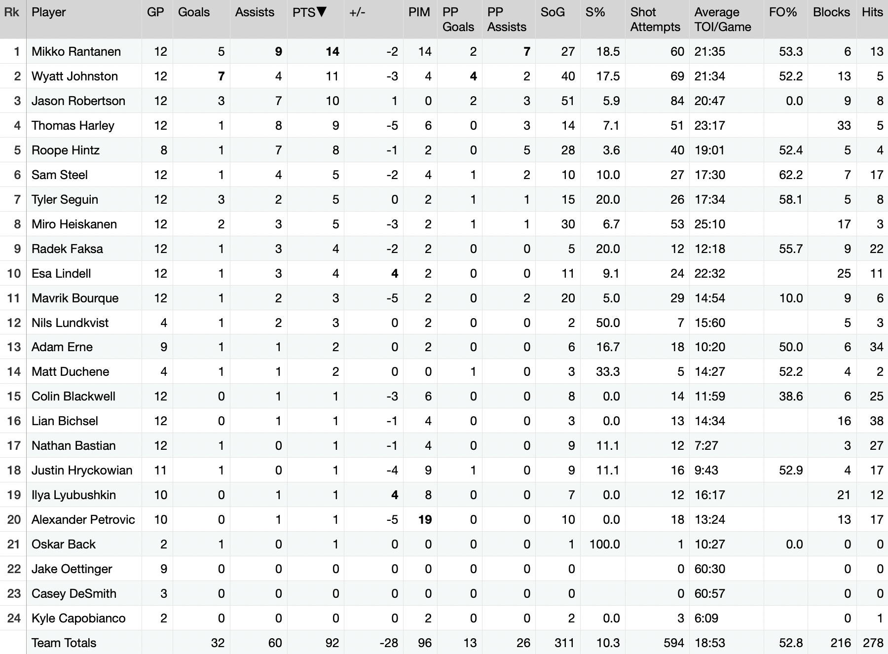 But enough about trying to evaluate the team as a whole. A dozen games seems like a great point at which to take a survey of the team as a collection of individuals—or at least the forwards, given how many injuries up front the Stars have been dealing with.