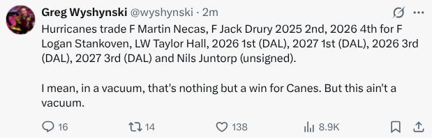 Nill paid a steep price just for the privilege of paying Mikko Rantanen $12 million for the next eight years after this one. That price? Four draft picks—two first-rounders and two third-rounders—as well as one of their top rookies in Logan Stankoven. Those went to Carolina, who probably needs to flip at least one of those firsts to bring in more forward help if they don’t want a riot in their dressing room.