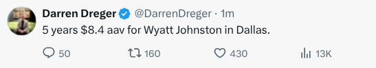 I truly wonder what this says about Carolina—doesn’t it seem like a slap in the face for Rantanen to refuse $13M from them to sign for less in Dallas? Maybe he didn’t like Rod the Bod’s system, the Canes’ famously bad arena per the players themselves, Raleigh, Tulsky’s face…
