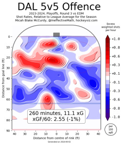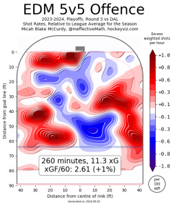 And that’s reflected in the shot locations, too, as you can see below. Both teams are managing to get to the netfront (with Edmonton doing so more effectively than Colorado or Vegas ever did), but Edmonton’s other shots are primarily coming from the Leon Draisaitl zone in the left circle and the right point (as you saw on their third goal Friday), with Dallas saving up their shots for the low slot, right circle, and the middle of the high point.