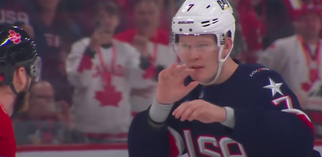 As a result, USA ended up playing a meaningless game with a roster of only 17 NHL skaters, which would be reduced even further to 16 after Brady Tkachuk saw a McDavid sweater in the crowd and his eyeballs turned completely white, after which he ran into a goalpost and left the game before the first period was over.