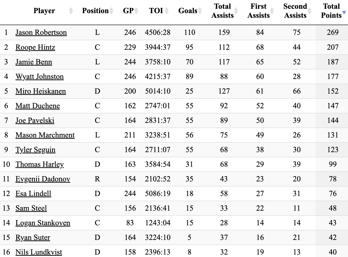 That’s not to say Robertson is their only offensive threat, of course—particularly since they acquired one of the very few guys above him on those leaderboards at the deadline—but it is a fact that scoring tends to peak early in a player’s career. To that end, Robertson is younger than Rantanen, Hintz, Duchene, Benn, and Seguin. You absolutely cannot count on older players even maintaining their same production from year to year, let alone increasing it to fill a void the size of Robertson’s, should that come to pass.