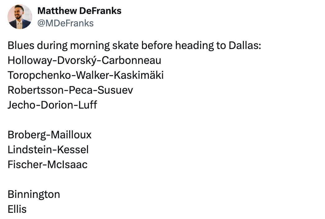 Here are the Blues lines and pairings, courtesy of someone vaguely familiar: